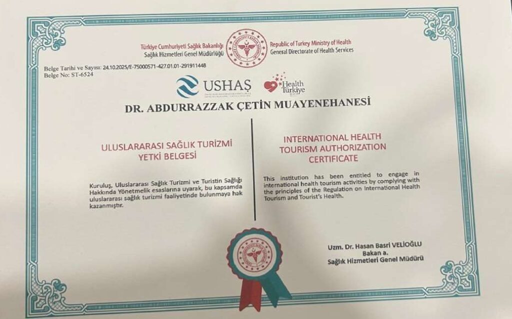 Tesisimiz, Uluslararası Sağlık Turizmi ve Turistin Sağlığı Hakkında Yönetmelik kapsamında, Uluslararası Sağlık Turizmi Sağlık Tesisi Yetkinlik Kriterleri’ne ve Yönetmeliğin genel esaslarına uyarak, Uluslararası Sağlık Turizmi faaliyetinde bulunmaya hak kazanmıştır.